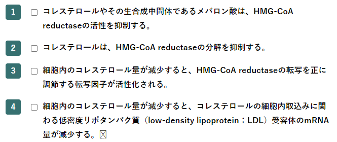 以下は、コレステロール量の調節に関する説明文である。これに関する記述のうち、正しいのはどれか。2つ選べ。