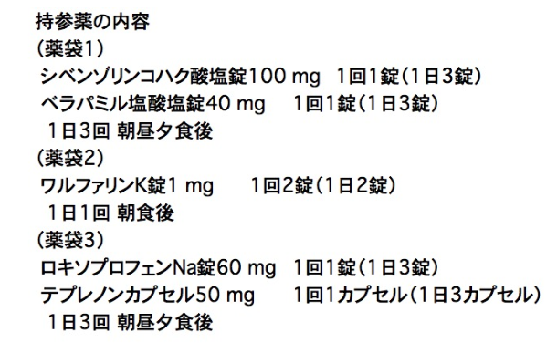 kg。めまい、ふらつき、冷汗、軽度の意識障害を主訴として受診し、入院することとなった。入院時に病室を訪問した薬剤師が持参薬を確認したところ、下記の薬剤を日ごろ欠かさず服用していたことが分かった。入院時の血清クレアチニン値1.5