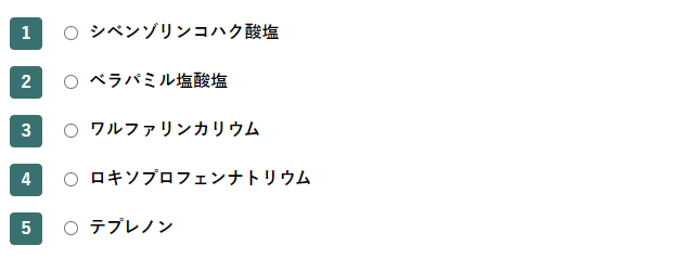 薬剤師はこの女性の主訴の原因として、服用中の薬物の副作用を疑った。最も可能性の高い薬物はどれか。1つ選べ。