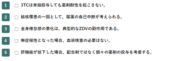 67歳男性。16年前にHIV感染が判明し、ジドブジン(ZDV)とラミブジン(3TC)による治療を開始したが、7年前から服薬を自己中断していた。6年前の結核罹患を契機にロピナビル・リ卜ナビル(LPV・RTV)配合剤を追加して治療を再開したが、その2年後から再び服薬を自己中断していた。全身倦怠感が徐々に進行し、血液検査(CD4陽性リンパ球、HIV-RNA定量)の結果、3TC・アバカビル硫酸塩配合剤とLPV・RTVによる治療を開始することになった。