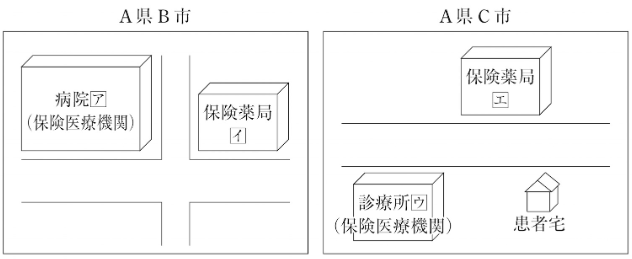下図は、ある県内の保険医療機関2施設、保険薬局2施設及び患者宅との位置関係を図示したものである。以下の説明のうち、適切なのはどれか。2つ選べ。