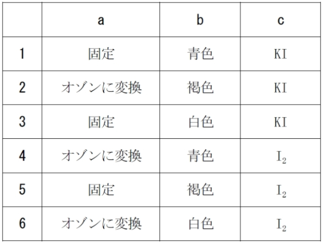 水中の溶存酸素(DO)の測定法(ウインクラー法)に関する次の記述のa、b、cに入るべき語句の正しい組合せはどれか。1つ選べ。