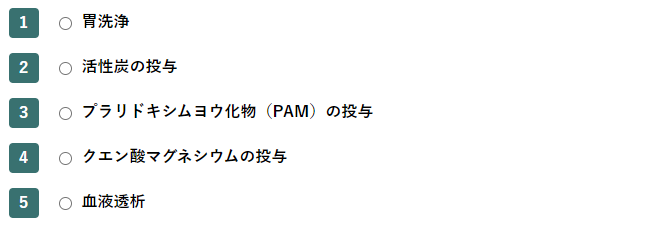 【実務】63歳男性。青緑色の吐物を嘔吐し、救急病院に搬送された。医師が家族から状況を聞くと、この男性は認知症であり、買い置きしておいたホウ酸団子をお菓子と間違えて3個食べてしまったという。この男性がホウ酸団子を食べてから5時間以上が経っている。ホウ酸団子とは、ホウ酸にタマネギ、小麦粉、砂糖、牛乳を加えてつくるゴキブリ駆除剤であり、1個あたり、約3gのホウ酸を含有している。担当医師から薬剤師に解毒方法を急いで調べてほしいとの連絡があった。