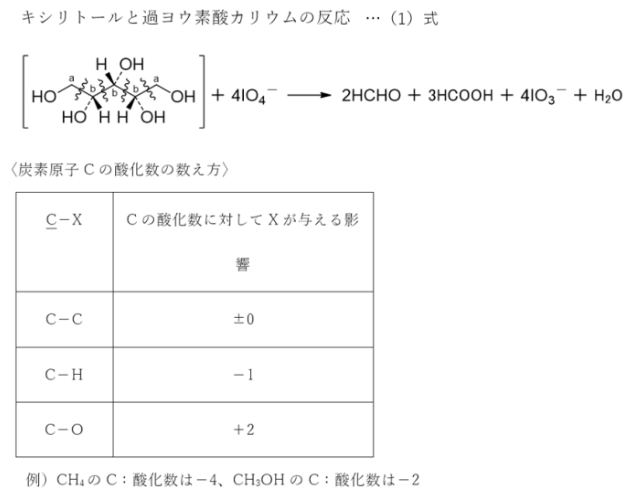 キシリトール中のaにおけるCの酸化数は-1であり、bにおけるCの酸化数は0であるが、酸化反応後、生成するホルムアルデヒドHCHOにおけるCの酸化数は0であり、ギ酸HCOOHにおけるCの酸化数は+2である。