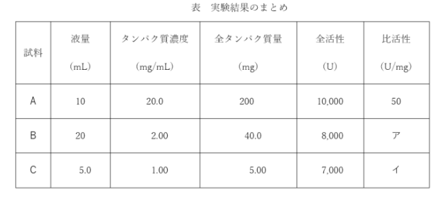 上記A、B及びCの液量、タンパク質濃度、全タンパク質量と酵素活性(全活性及び比活性)を以下の表に示した。比活性とは、試料中のタンパク質の単位重量当たりの酵素活性のことである。なお、酵素活性における1