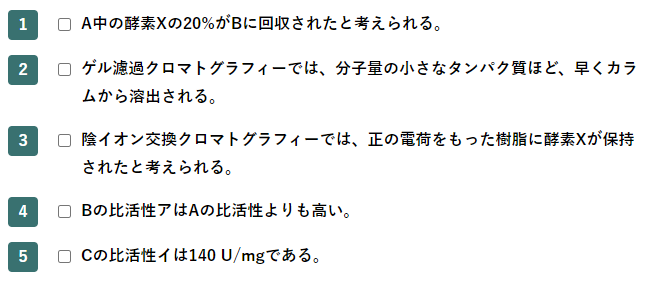 【生物】マウスの肝臓から酵素Xの精製を試みた。以下に実験手順の概要([1]~[4])を示す。