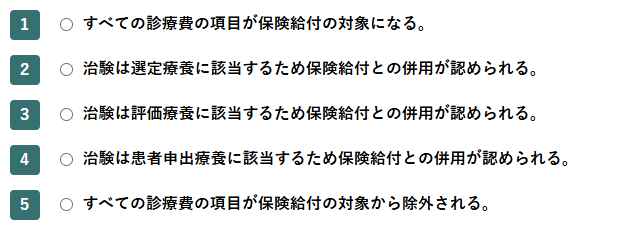 【法規】56歳男性、会社員。健康保険組合に加入しており、本人負担は3割である。現在、2型糖尿病と活動期の潰瘍性大腸炎のため、病院で治療を受けている。治療中の潰瘍性大腸炎の薬の効果が実感できず、製薬企業から病院へ依頼があったプラセボを対照薬とする二重盲検法による治験に参加することになった。ただし、2型糖尿病の治療は、DPP-4阻害剤を服用しているが、当該疾患は治験の対象外である。当該患者の治験実施期間内における診療費の取扱いに関する記述のうち、正しいのはどれか。1つ選べ。