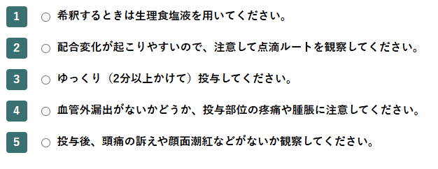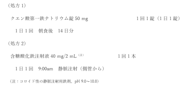 【実務】52歳男性。身長170 cm、体重65 kg。3年前、胃がんのため胃亜全摘切除手術を受け、近医で経過観察していた。今回の定期検診で肝転移が見つかり、化学療法導入目的で大学病院に紹介入院となった。全身倦怠感、動悸を自覚しており、貧血に対して処方1の薬剤が処方されていたが、入院時の血液検査の結果により、処方1に替えて処方2が開始された。処方2について、看護師から病棟薬剤師に、投与前後の注意事項や観察項目に関する情報提供の依頼があった。回答として誤っているのはどれか。1つ選べ。