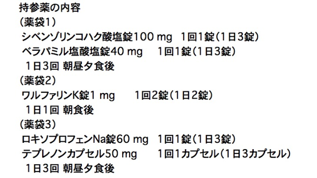 kg。めまい、ふらつき、冷汗、軽度の意識障害を主訴として受診し、入院することとなった。入院時に病室を訪問した薬剤師が持参薬を確認したところ、下記の薬剤を日ごろ欠かさず服用していたことが分かった。入院時の血清クレアチニン値1.5