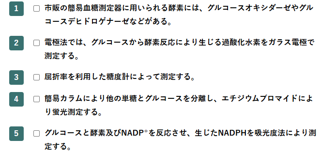 患者に低血糖症状が疑われたため、血糖値を検査することになった。血中グルコースの測定法に関する記述として正しいのはどれか。2つ選べ。